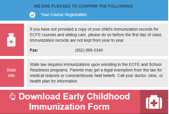 When a parent registers for an ECFE Course Section that requires immunizations, the system automatically provides a link in their Confirmation email to the Minnesota Department of Health's ECFE/School Readiness immunization form as shown below. As of September 2022, a reference to fax number and the fax number field was made optional. Any additional details your district wants to provide to parents would be added to the Confirmation Notes set at the ECFE Course or the Course Section level. They will appear in the Notes section of the email.