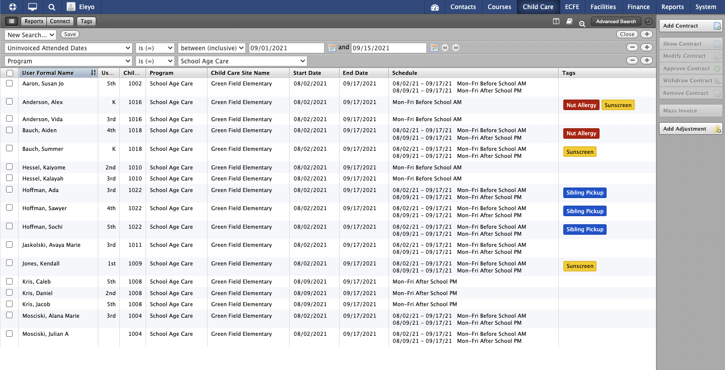 The list of contracts with uninvoiced dates within the program are displayed. - The results can be further refined by adding filters to the advance search, such as viewing a specific season or child care site.