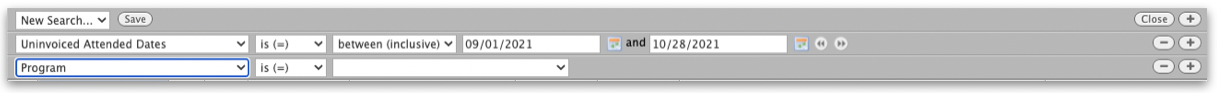 - Between (inclusive) - Is/Is not between the provided date values listed after the operator. Used to find contracts that have attended dates that have not been invoiced that are between two specified dates, or outside of the specified dates.